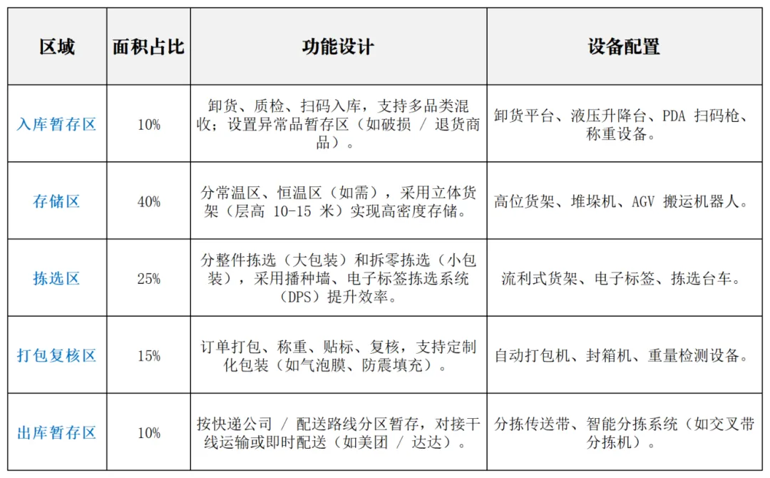 辅助设施:监控系统、消防系统、温湿度控制系统(针对特殊品类)。
